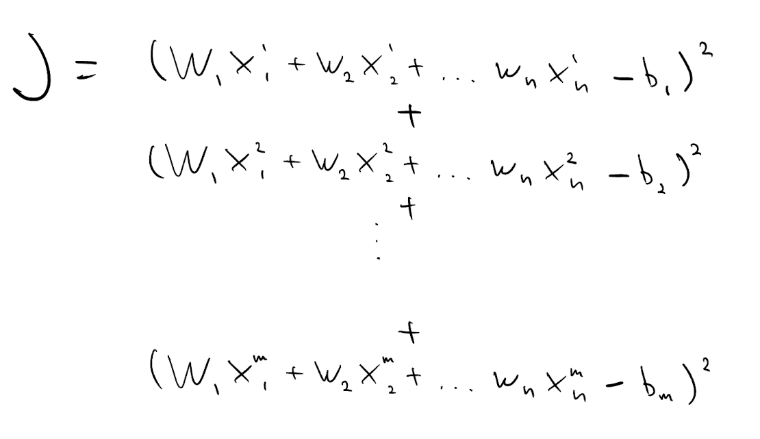 We can turn this into optimization problem by minimizing $J$, the sum of squared differences between left-hand side and right-hand side of each equation. These differences are known as residuals.