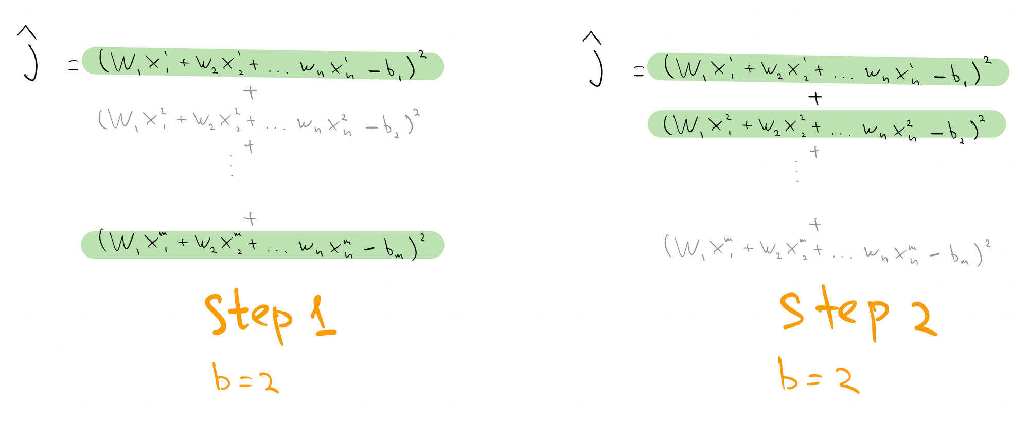 Reduce the cost by randomly sampling $b$ equations at each step of gradient descent, and using corresponding random objective $\hat{J}$ to compute descent direction.