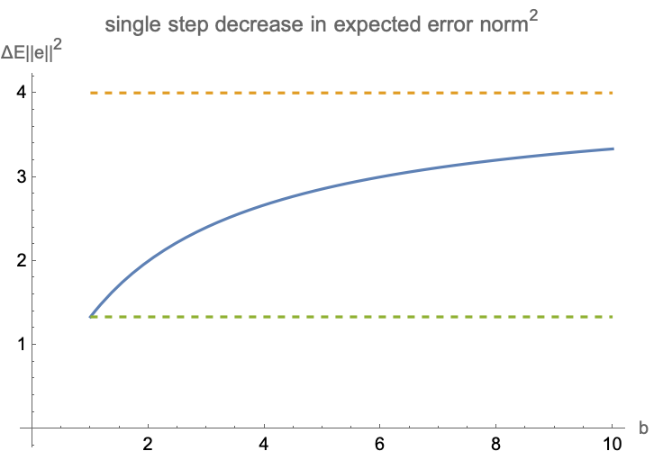 - in fully stochastic case $b=1$ and deterministic $x$ we get step size $1/\|x\|^2$, same as in the Kaczmarz algorithm