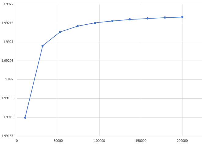 We can use numerical integration to plot the optimal step size as a function of dimensionality. Since our largest coefficient is 1, the largest convergent step size is 2. Meanwhile average optimal step size approaches 2 in high dimensions.