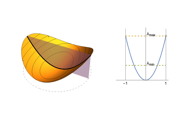 $$\frac{1}{2}(\lambda_1 x^2 + \lambda_2 y^2)$$Since we can converge in a single step, look at the section defined by the starting point and 0. This gives us a 1-dimensional quadratic, whose curvature is between $\lambda_1$ and $\lambda_2$ depending on the starting point. Hence the “optimal” step size is between $1/\lambda_1$ and $1/\lambda_2$, and to get the average value we take expectation over possible starting points.
